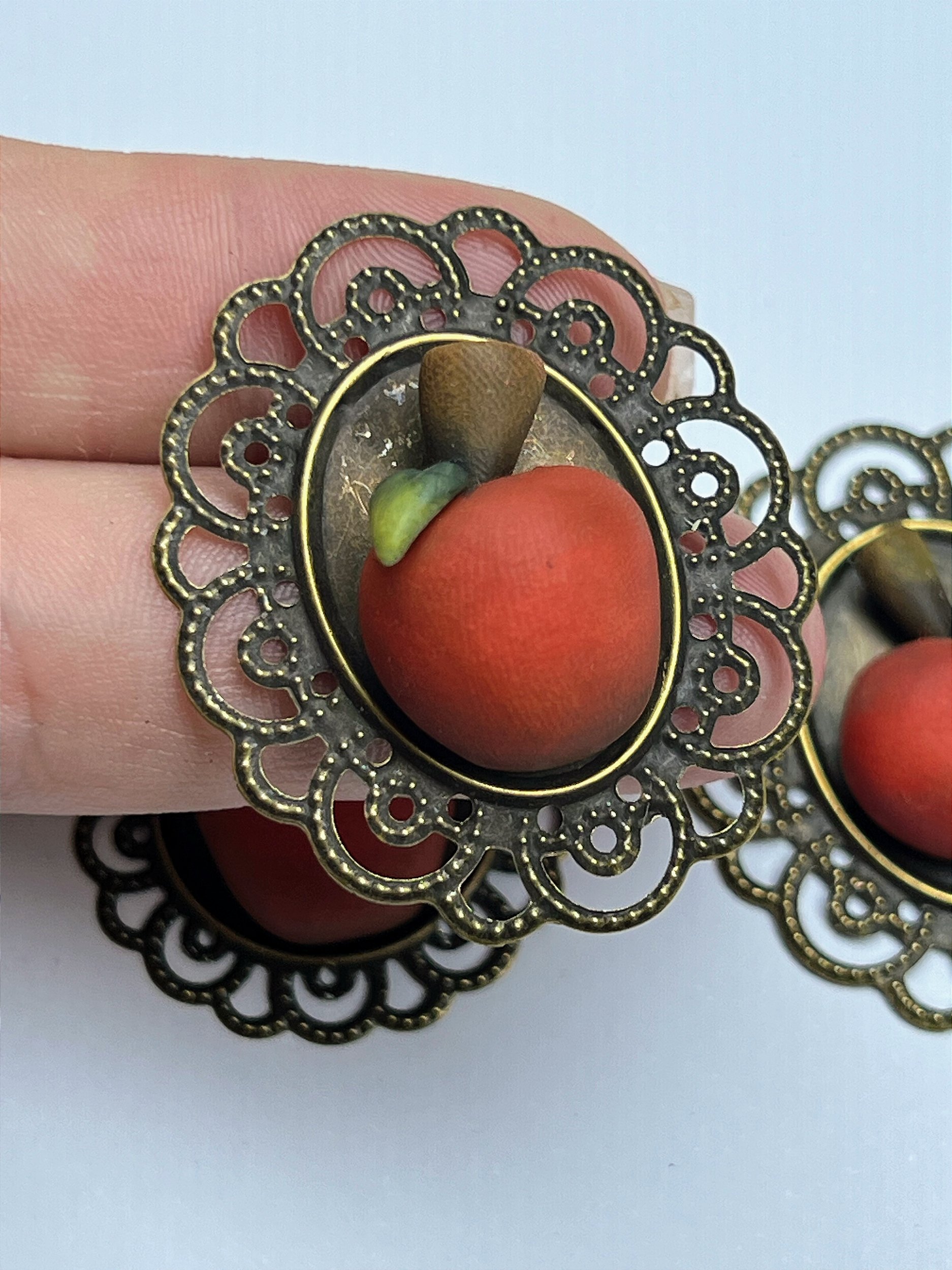 Camafeu de metal com maçã trabalhada em biscuit pintada a mão. Produto artesanal.