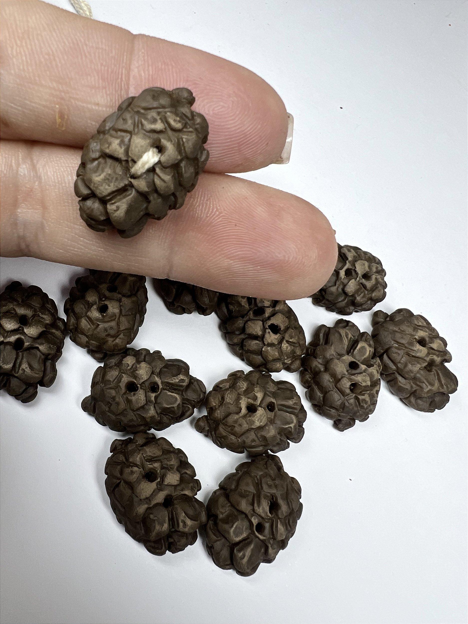 Botão de biscuit modelado em forma de pinha e pintado a mão.
